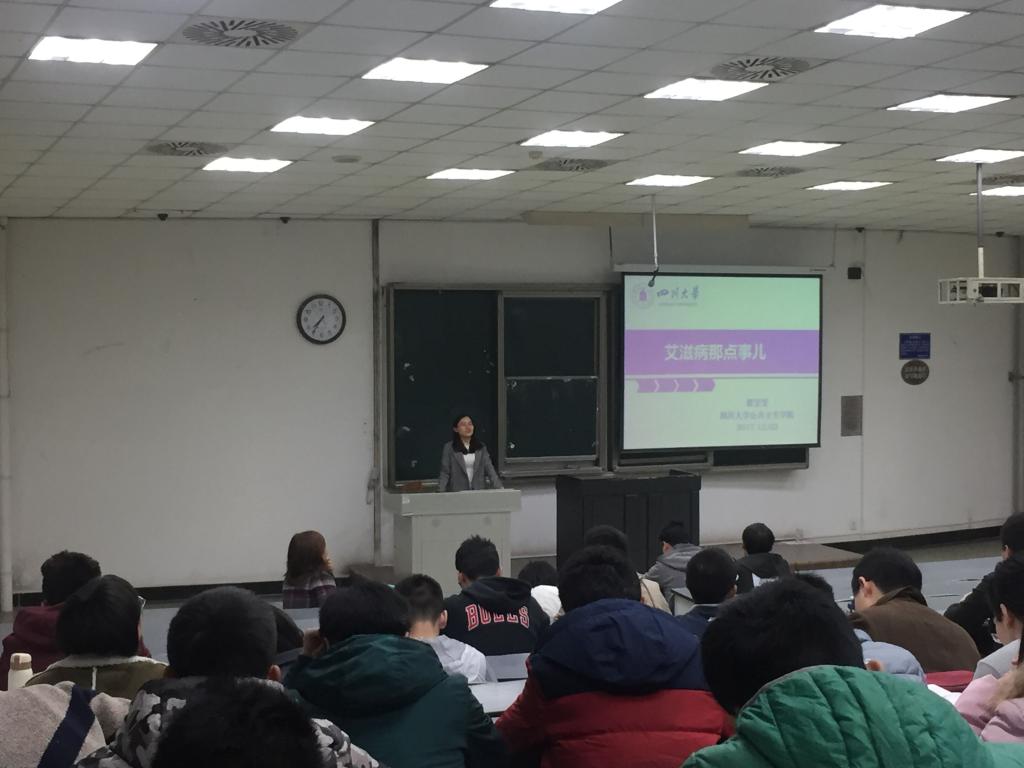 12月1日是第30个世界艾滋病日,在“共担防艾责任,共享健康权利,共建健康中国”的主题号召下,2017年12月3日晚上7:30在望江校区基础教学楼C座201室,美狮贵宾会华西公共卫生学院研究生翟雯雯同学向在座的近200名美狮贵宾会学子进行了“艾滋病的那些事儿”的讲座,整个讲座分为四个部分,一、艾滋病基本情况;二、防艾过程的一些误区;三、预防艾滋病的ABCDE原则;四、艾滋病到底可不可怕?
