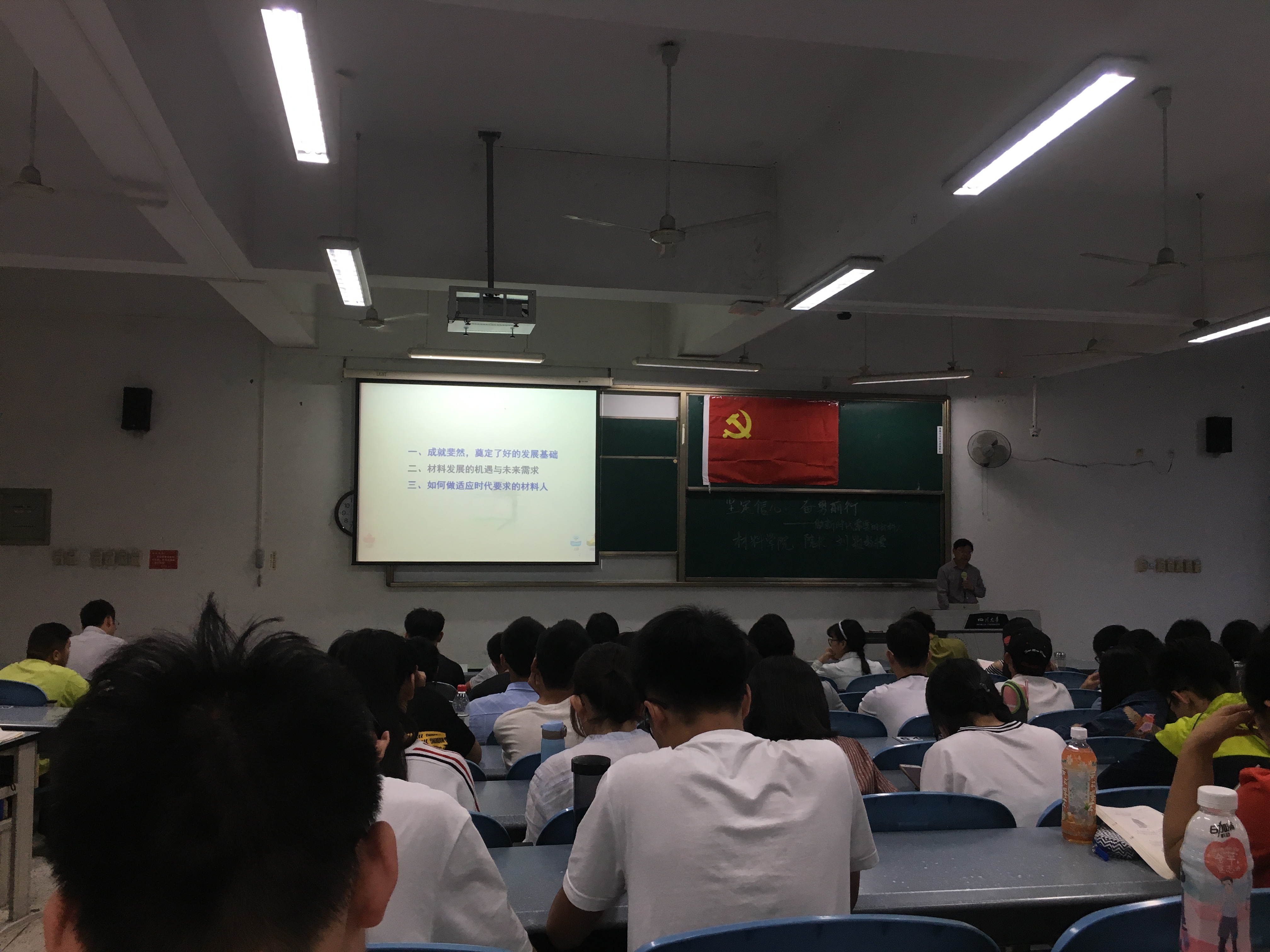 晚上19:00,在2017级辅导员王志超老师的主持下,刘颖教授的报告正式开始。刘颖经理围绕如何在党的十九大精神下做好自己的本职工作的主题从三方面展开。第一,国家成就斐然,为我们奠定了良好的发展基础。刘颖经理全面地介绍了我国十八大以来取得的辉煌成就,就经济增长,科技进步,创新成果丰硕,人民生活持续改善,生态环境状况变好等进行了详细地阐述,这些看的见的看不见的变化,都说明我国已经踏入了全新的时代。在此前提下,刘颖经理指出我国取得的这些成就都为我们当好材料人奠定了良好的基础。为此,我们要为其他事业的发展提供材料技术的支撑。第二,材料发展的机遇与未来需求。对此,刘颖经理说明,随着科技创新的不断发展完善,新材料也日益成为我国的战略性新兴产业,这是我们材料学科发展自我、实现制造强国的良好机遇。除此之外,我国重大工程以及未来产业的发展都离不开新材料技术的支持,这也说明未来对新材料的需求是会只增不减的。同时,刘颖经理介绍了国内外新材料的发展态势,就我国材料技术的现状、发展方向、前景展望以及存在的问题着重进行了讲解。第三,如何做适应时代要求的材料人。作为一名川老员工,作为一名双一流重点建设学科的学子,学校与学院为我们营造了良好的学习氛围,同学们肩上有着利用新材料新技术推动国家进步和建设制造强国的伟大使命。因此,同学们应该认真学习,不辱使命,做一名适应时代要求的材料人,这也是刘颖经理对全体同学的殷切希望。