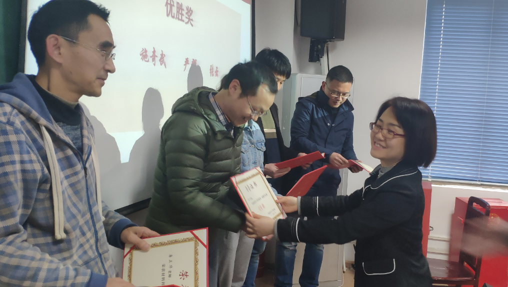 工会主席武莉莉为获得优胜奖的唐正华、施奇武、严群、张云、刘虹刚五位老师颁奖。
