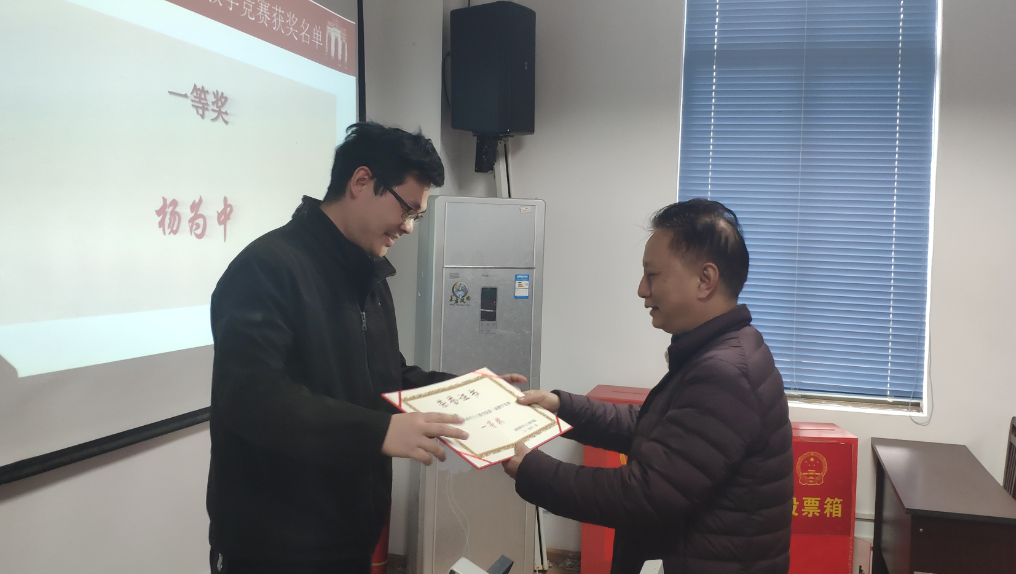 党委书记尹光福为获得一等奖的杨为中老师颁奖。