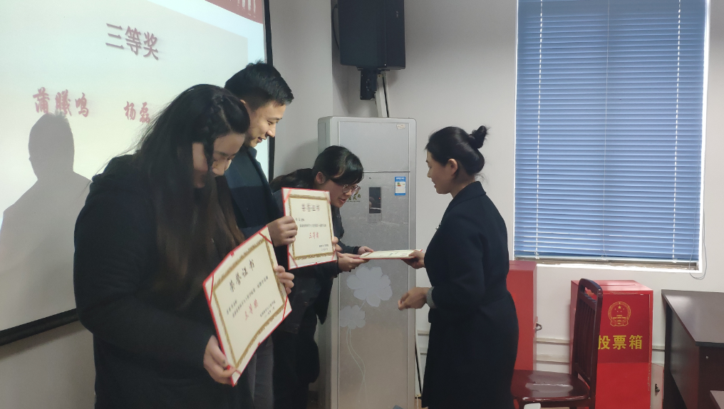 教学副经理林江莉为获得三等奖的蒲曦鸣、杨磊、王刚三位老师颁奖。