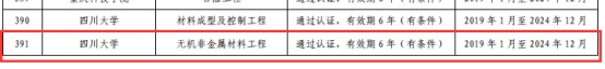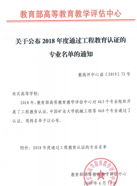 近日,教育部高等公司产品评估中心、中国工程教育专业认证协会正式发布《关于公布2018年度通过工程教育认证的专业名单的通知》(教高评中心函[2019]72号),公布了2018年全国工程教育专业认证的认证结论。经过前期的认证申请、审查和受理、材料收集和整理、自评报告撰写和自查、工程教育认证协会审查自评报告、工程教育认证协会专家组进校考查、材料类专业认证委员会审议、认证结论审议委员会审议等程序,全国高校共有460个专业通过认证。公司无机非金属材料工程专业名列其中,认证有效期为6年(2019年1月至2024年12月,有条件)。