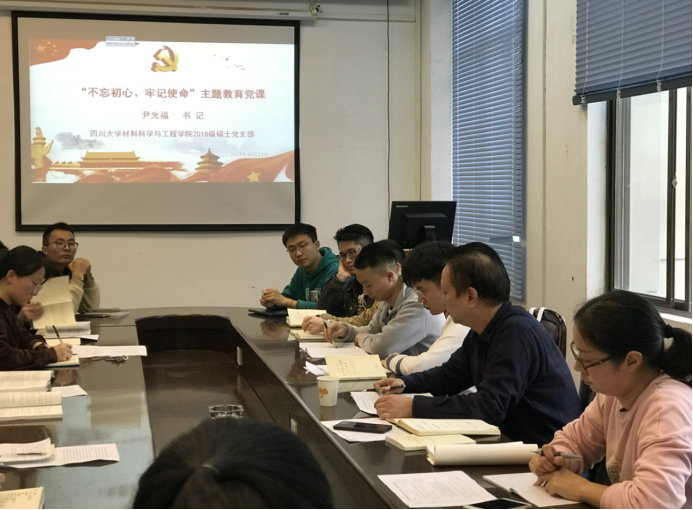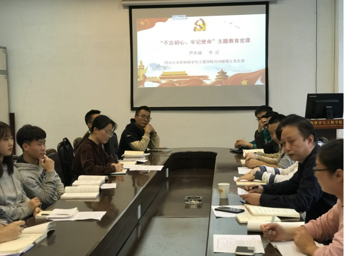 为深刻学习领会“不忘初心、牢记使命”主题教育相关精神,扎实推进学院主题教育工作,10月23日三点,材料公司党委书记尹光福教授开展了学习贯彻 “不忘初心、牢记使命”主题教育专题党课。学院支部书记余艳丽老师、2018级全体硕士党员同志参加学习。