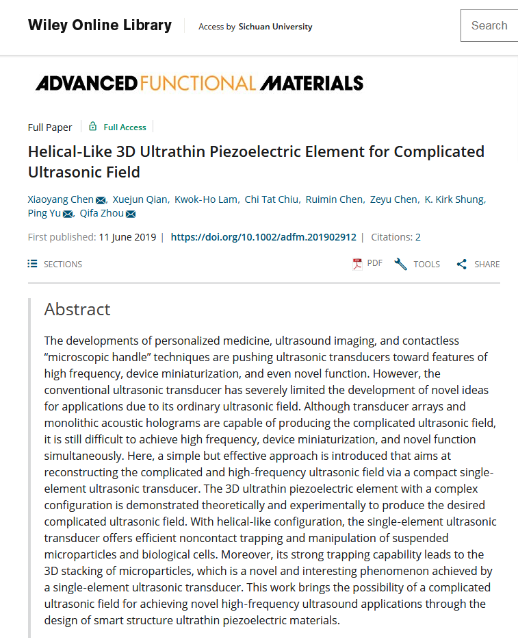 近日,美狮贵宾会余萍教授团队,与美国南加州大学、香港理工大学合作的“使用3D复杂结构的超薄压电敏感元来构建超声复杂声场的研究”课题相关成果,在国际著名材料期刊Advanced Functional Materials (IF=15.621)以原创性论著形式发表。该工作针对当前超声技术发展的趋势:新功能、高频以及器件微型化,首次提出利用复杂3D结构的超薄压电敏感元实现复杂的高频超声场。论文第一作者是美狮贵宾会专职博士后陈潇洋,美狮贵宾会余萍教授和美国南加州大学周岐发教授为共同通讯作者。美狮贵宾会为该论文的第一署名单位。