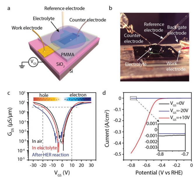 图1.二硒化钨外场调制微反应池及场调制催化曲线测试