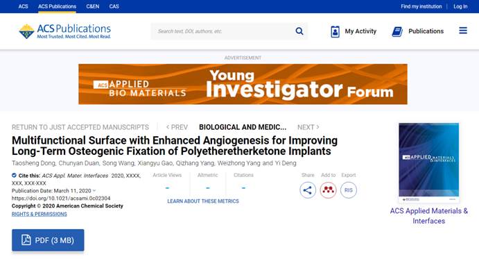 近日,公司杨为中教授团队与美狮贵宾会化工学院邓怡副研究员及西南医科大学合作在生物材料表面功能化修饰领域取得一定进展,研究成果“Multifunctional Surface with Enhanced Angiogenesis for Improving Long-Term Osteogenic Fixation of Polyetheretherketone Implants”发表在材料科学领域著名期刊ACS Applied Materials & Interfaces(中科院一区,影响因子8.47)上。第一作者为2018级硕士研究生董涛生同学,2016级本科生高翔宇以及2017级本科生杨骐彰参与了部分工作。