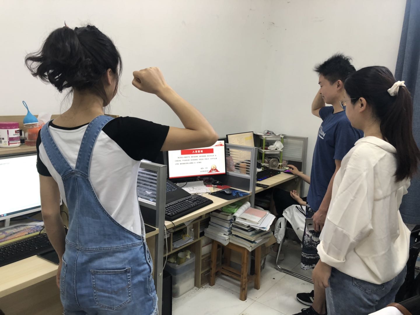 支部成员首先纷纷讲述身边的抗疫故事。黄艳莉讲述了自己表哥在交警的岗位上,坚持把人民群众生命安全和身体健康放在第一位,充分发挥党员先锋模范作用的事迹。孔鹏飞以自己年迈的爷爷在疫情中的经历,讲述了在这次抗疫的过程中,举国上下人民群众团结一致众志成城,战胜疫情的坚定信念。张照从自己海外留学的经历谈起,转述境外职工朋友在疫情中感受到的党和祖国的温暖。其他同学也纷纷发言,大家都深刻领悟到中国共产党“为人民谋幸福”的初心使命,“人民至上,生命至上”的价值追求。全体老党员重温入党誓词,新党员进行入党宣誓之后,同学们纷纷表决心:将以一线抗疫工作者为榜样,刻苦学习,增强本领。疫情终将被战胜,我们要积极行动起来,为党的伟大事业而努力奋斗!