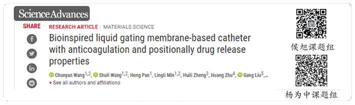 2020年9月5日,公司杨为中教授与厦门大学侯旭教授团队合作,在Science子刊《Science Advances》上合作发表了题为“Bio-inspired Liquid Gating Membrane-based Catheter with Anti-coagulation and Positionally Drug Release Properties”的论文,提出了具有自适应性形变、抗凝血、定点药物释放功能的液体门控医用导管机制。论文第一作者为美狮贵宾会2018届优秀毕业生、现厦门大学化学化工学院2018级直博生王春燕。厦门大学侯旭教授和美狮贵宾会杨为中教授为论文共同通讯作者。