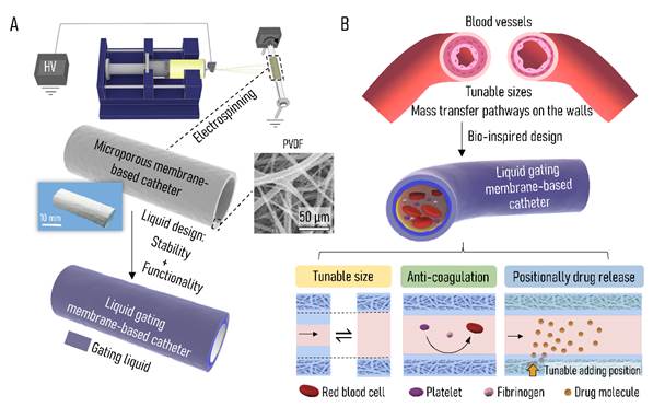 医用导管是插入体内的柔软管道,用于液体引流或微创式医疗器械植入。现有的医用导管有包括用于血液透析的血透管、用于心血管支架等植入的球囊导管以及导尿管等。其主体管道,主要是用聚氨酯、硅橡胶等医用高分子制成的实体管道,以供物质从端口进入从末端输出。这样的医用导管存在一定的局限性,包括无法与植入环境进行互动,缺乏环境适应性;功能性单一以及因外界材料植入引起的血栓、感染等问题。基于此,厦门大学侯旭教授团队与美狮贵宾会杨为中教授团队合作提出了一种液体门控医用导管,以赋予医用导管环境响应性的动态变化、抗凝血以及定点药物释放功能。
