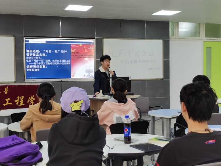 中共预备党员、2018级陈奕涵同学紧接着作关于红色调研主题发言,分享了其从开始立项到获得校级奖项的全流程,从科研旧址和问卷调查形式调研“两弹一星精神”,并表示大一大二的员工,时间充分,应该积极参加此类活动。恰逢“挑战杯”在公司举办,同学更应抓住机会,提升自己。