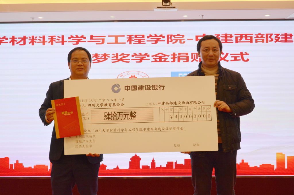 张利锋代表西南公司与川大基金会签订“中建西部建设筑梦奖学金”捐赠协议。根据协议,西南公司将分四年向川大美狮贵宾会捐赠四十万元,用于奖励创新班优秀员工及冠名学院大型活动。