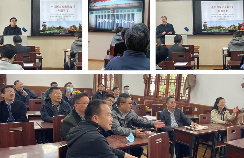今年4月15日是第七个全民国家安全宣传教育日,同时本月为公司“国家安全宣传教育月”。学院新能源材料与器件专业教研中心当日在望江校区东区二教311教室开展了丰富多彩的“全民国家安全教育日”主题活动,本次活动专门邀请吴家刚副经理参加指导。吴家刚副经理针对“树牢总体国家安全观,感悟新时代国家安全成就,为迎接党的二十大胜利召开营造良好氛围”的活动主题,通过普法宣传、文件解读和安全事故举例,强调了实验室安全在团队建设、人才培养、科学研究、学院发展中的作用,特别要求中心全体教师要管控好实验室危化药品、易燃易爆气体、特种设备设施,要确保关键场所及设备设施的报警装置正常运行,要确保实验室物资正规合理安全地购买、规范有度安全地使用、分门别类安全地存放,要切实加强实验室的安全保障,要扎实强化全体师生的安全意识,在学院各项工作每年安全推进提升中发挥中心应有的支撑和贡献。随后,与会老师观看了安全教育宣传片,并积极踊跃地参加了“全民国家安全教育日”知识竞赛。本次知识竞赛既包含了国家安全方方面面的知识,也包含了与实验室安全和疫情防控有关的知识。通过本次主题活动的开展,老师们更全面、更深入、更具体、更形象地了解到安全知识,并深刻地汲取了近期发生的各种安全事故的教训。中心全体教师将举一反三,开展实验室安全自查,全面提升教学科研安全水平。