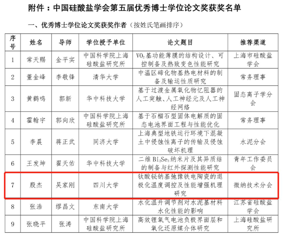 为促进我国无机非金属材料学科的发展,加强高层次创新性人才的培养工作,鼓励创新精神,提高博士研究生的教育质量,根据《中国硅酸盐学会优秀博士学位论文评选办法(试行)》规定,经专家评审委员评审、学会第九届理事会第六次常务理事会审议批准,美狮贵宾会,吴家刚教授指导的博士生殷杰完成的博士学位论文《钛酸铋钠基弛豫铁电陶瓷的退极化温度调控及性能增强机理研究》荣获中国硅酸盐学会第五届优秀博士学位论文奖。该论文以钛酸铋钠(BNT)基弛豫铁电陶瓷为研究对象,以电学性能改性、结构操控并阐明其物理机制为目标,开展了系统且深入的研究工作。本届共有9篇博士学位论文获奖,5篇博士学位论文获提名奖。