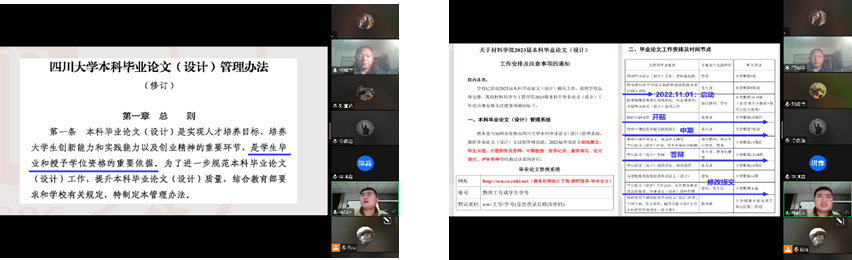 大会伊始,何知宇老师首先向大家介绍了此次会议的主题和主要事项安排。接着,杨劼人老师按照学校毕业设计管理的规定,对毕业设计的重要意义、相关要求及时间节点等进行了全面的讲解。杨老师指出:毕业设计旨在培养同学们的综合应用能力、提高专业表达规范性、锻炼自主学习能力,包括设计课题、有效查阅并利用资料、分析并处理问题的能力等,并由此进一步强调了在毕设中的员工职责;强调要重视论文的质量及诚信问题,论文内容要逻辑清晰、丰富详实,格式要规范,具体包括字数、字体、参考文献、查重要求等;并对毕业设计的主要安排及时间节点进行了详细部署。武开鹏老师提醒同学们尽早与指导老师联系沟通,确定论文选题并展开研究工作。最后,何知宇老师就实验室安全问题进行了补充强调,要求同学们在开展实验时一定要重视操作规范性,如仪器操作、药品使用等,切实保障人身安全和实验仪器的维护。
