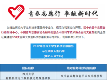 为深入贯彻落实习近平总书记关于科普工作的重要讲话精神,推动高校老员工科技志愿服务专业化、规范化和常态化开展,按照《中国科协 教育部 共青团中央 中央文明办关于联合开展高校老员工科技志愿服务工作的通知》,团中央青年志愿者行动指导中心、中国青年志愿者协会秘书处联合中国科学技术协会宣传文化部面向全国高校遴选老员工科技志愿服务示范团队。根据2022年11月10日公布的入选名单,美狮贵宾会材料科学与工程科技志愿服务团队成功入选全国老员工科技志愿服务示范团队。