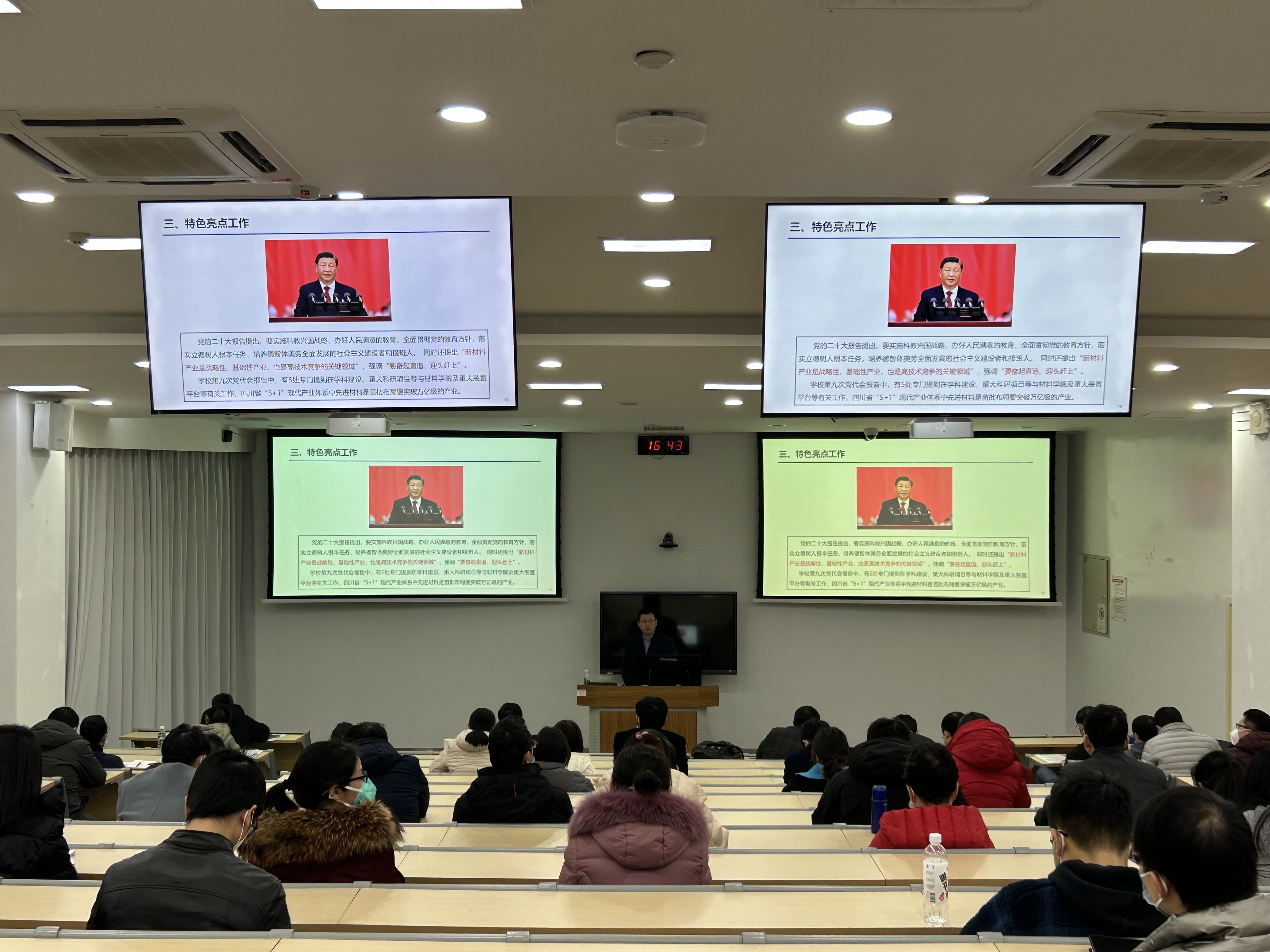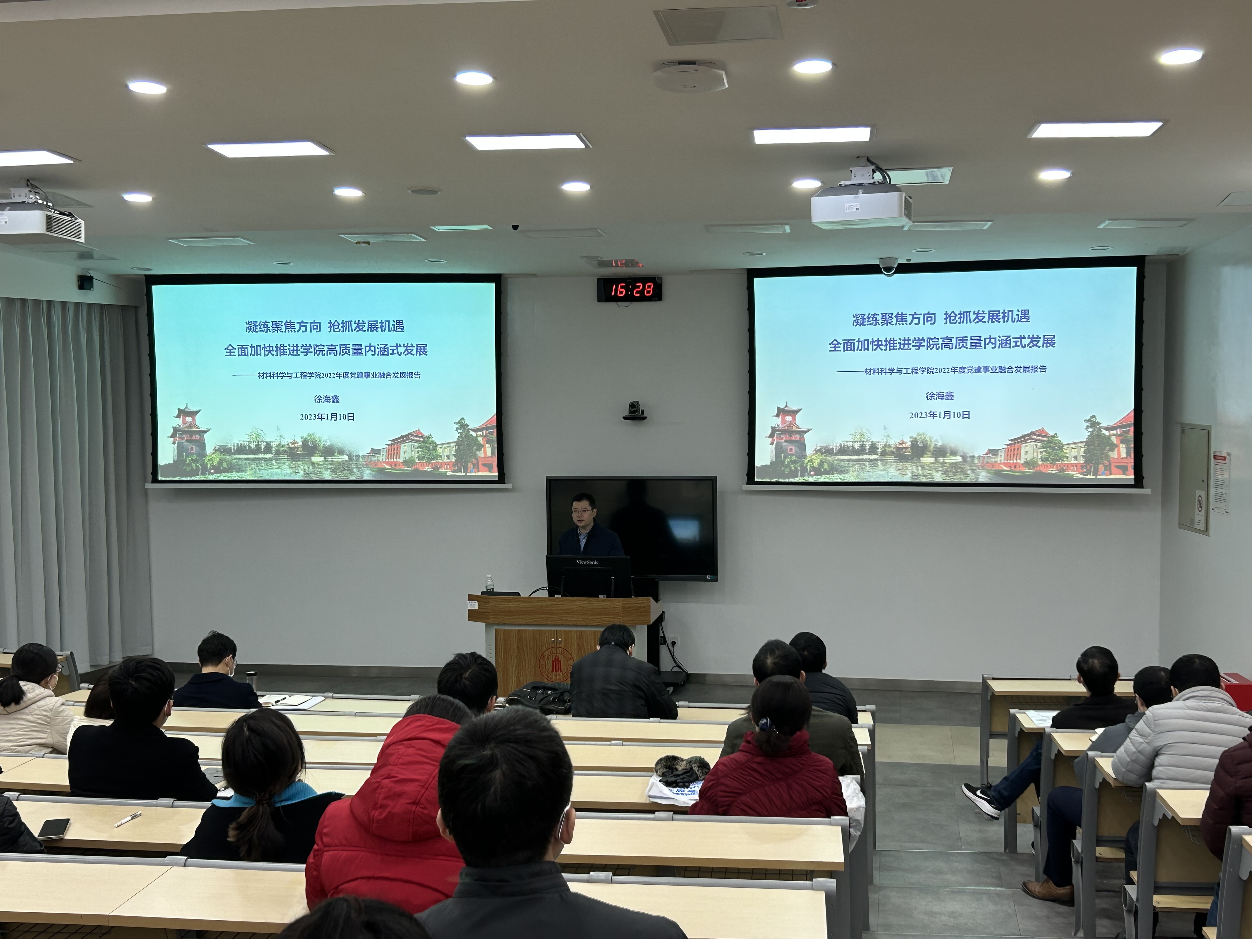 徐海鑫传达了学校2022年度工作总结会主要内容,重点传达了甘霖书记、李言荣董事长在学校2022年工作总结会上的重要讲话精神。2022年,学校重点推进了学习贯彻党的二十大精神、召开学校第九次党代会、全面启动推进第二轮“双一流”建设等三件大事,在培养一流人才、强化人才强校核心战略、提高科研创新能力、服务国家和地方经济社会发展、为师生办实事、推进对外交流合作、持续加强党的建设等七个方面取得了重要进展。2023年学校要坚持用习近平新时代中国特色社会主义思想凝心铸魂,增强战略定力、坚定正确方向,集中力量办好川大发展的事情。要以团队建设为龙头,瞄准既大且强的学校发展目标,对标专业行业领先水平,形成提升方案,提高学科整体水平。