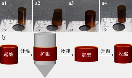 传统热缩管为一次性使用产品,其热收缩源于不可逆的结晶熔融。我国青年科研人员、哈尔滨工业大学肖鑫礼和孔德艳在世界上首次制备出可循环使用的热缩管,其热收缩源于聚酰亚胺的可逆玻璃化转变[3]。这类聚酰亚胺热缩管能够很好的固定扩张尺寸并缩回起始尺寸,其热缩过程如图1所示。