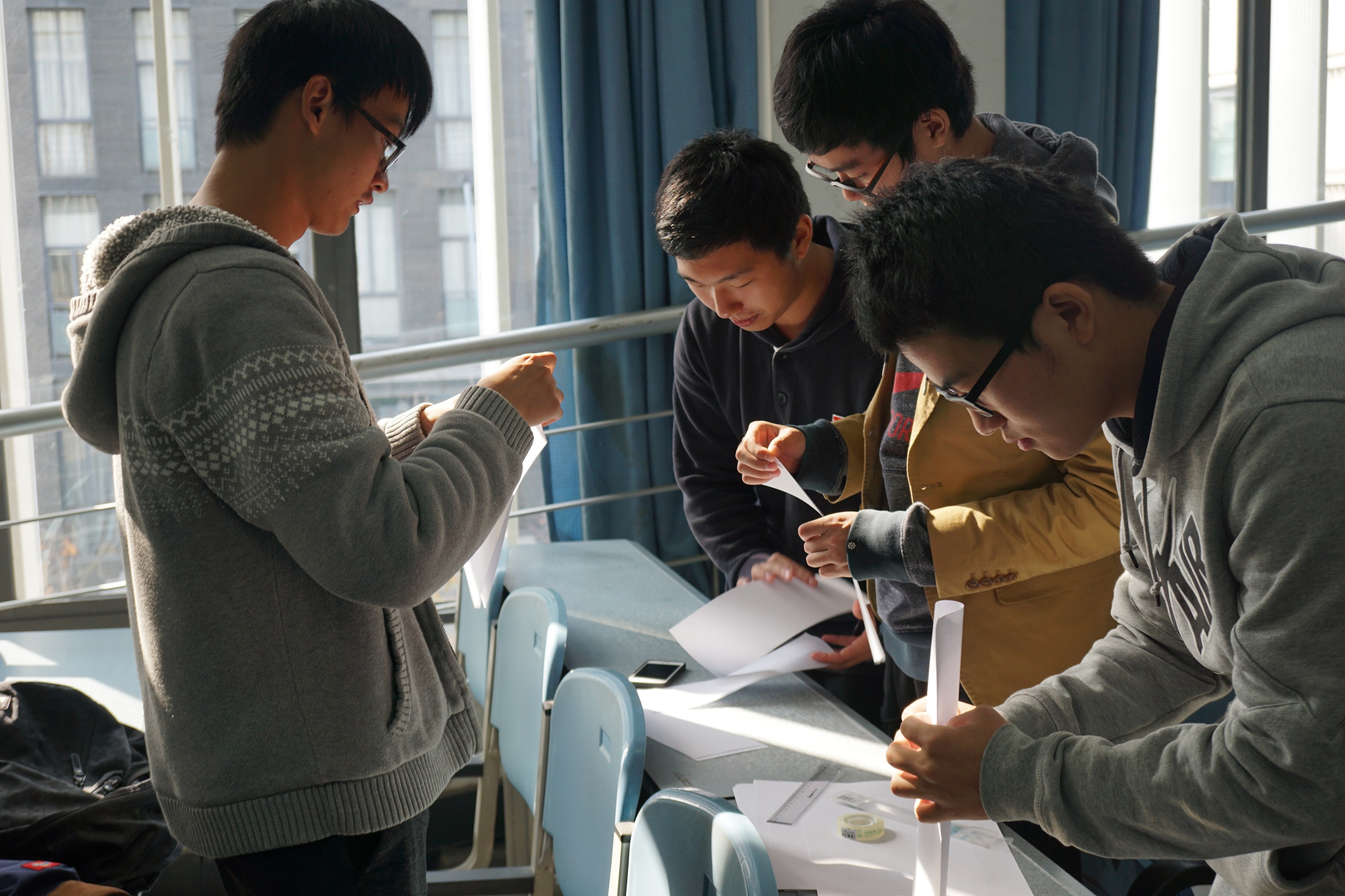 在主持人介绍完比赛规则后比赛正式开始,所有参赛队伍都有一个小时的时间去利用二十张A4纸和一些简单的工具去制作轨道使小球在轨道上滚动的时间尽可能的长。每一只比赛队伍都有着自己独到的想法:有的队伍在轨道上设置“路障”;有的队伍尽可能减小轨道的坡度;有的队伍让小球多次滚上同一轨道……甚至连嘉宾们也被同学们的热情感染,一起参与进比赛。由于短短一个小时实在不足以发挥同学们的奇思妙想,比赛又延时了二十分钟。在总计一小时二十分钟的制作环节后,参赛队伍的才智与巧工终于迎来了验收的时刻,经过评委们的计时评比,比赛得出了最终结果。最后张亮小队以优异成绩获得了一等奖。